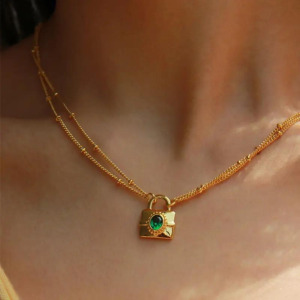 Collar, Cadena de Clavícula Doble, Acero Inoxidable con Colgante Candado embutido con pedreria verde chapado en Oro