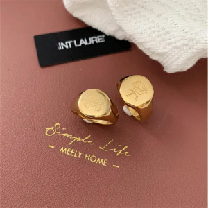 Anillo de sello grabado con flor silvestre redonda - acero inoxidable, chapado en oro 18 k