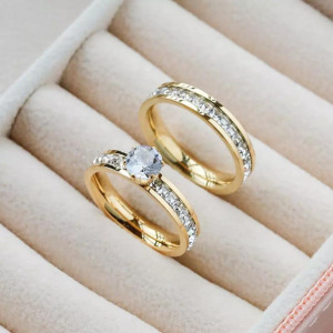 Anillo Solitario, doble acero inoxidable de compromiso, chapado en oro 18k