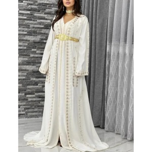 Caftán marroquí blanco y dorado Splendorous de Dubái Abaya con cinturon