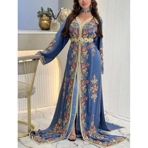 Caftán musulmán de Dubái con cristal bordado y encaje hecho a mano de lujo en azul con cinturón