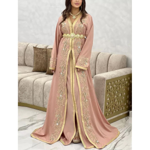 Caftán marroquí color durazno y dorado Splendorous de Dubái Abaya con cinturon