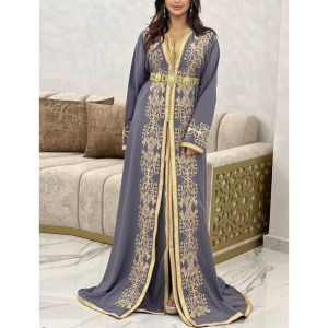 Caftán marroquí color gris y dorado Splendorous de Dubái Abaya con cinturon