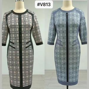 Vestido de oficina tallas grandes corte tubo cuello redondo manga 3/4 estampado a cuadros en gris y marron