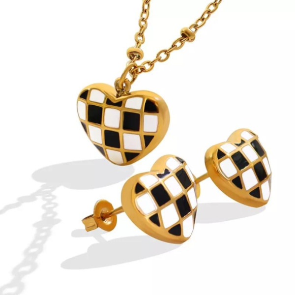 Tipo producto Joyería Tipo Joya Set de joyas Composición Acero Inoxidable Parilti SKU ps-jset027 Juego de Collar y Pendientes estilo Tartán forma de Corazón Acero Inoxidable Esmalte chapado en Oro Solicito presupuesto