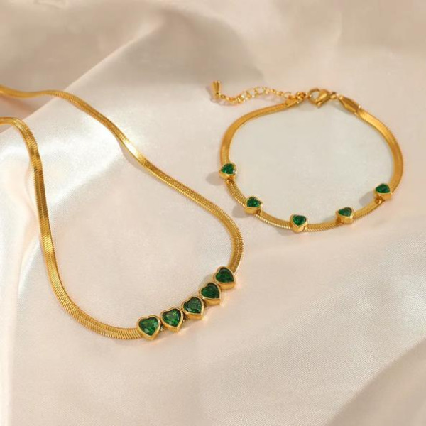 Tipo producto Joyería Tipo Joya Collar Composición Acero Inoxidable Parilti SKU ps-coll056 Juego de Collar y pulsera diseño Corazon, chapado en Oro con pedreria verde Solicito presupuesto