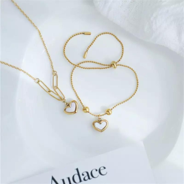 Tipo producto Joyería Tipo Joya Set de joyas Composición Acero Inoxidable Parilti SKU ps-jset014 Juego de Collar y Pulsera Dulce Forma de Corazón Acero Titanio chapado en Oro Solicito presupuesto