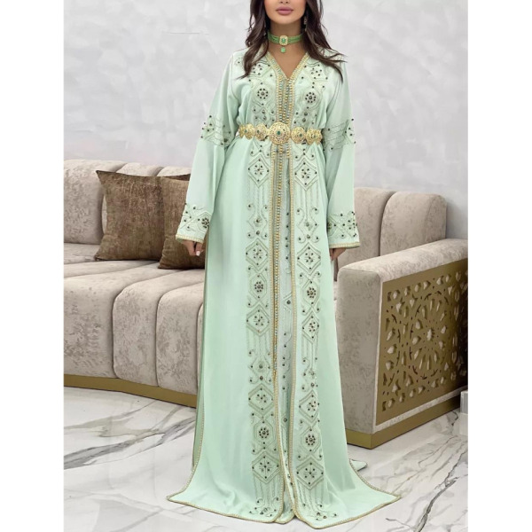 Tipo producto Ropa de Vestir Categoría Ropa de Vestir Vestidos Summer ONE SKU ps-mujarab017 Caftán marroquí verde claro y dorado Splendorous de Dubái Abaya con cinturon S -M-L-XL-XXL Solicito presupuesto