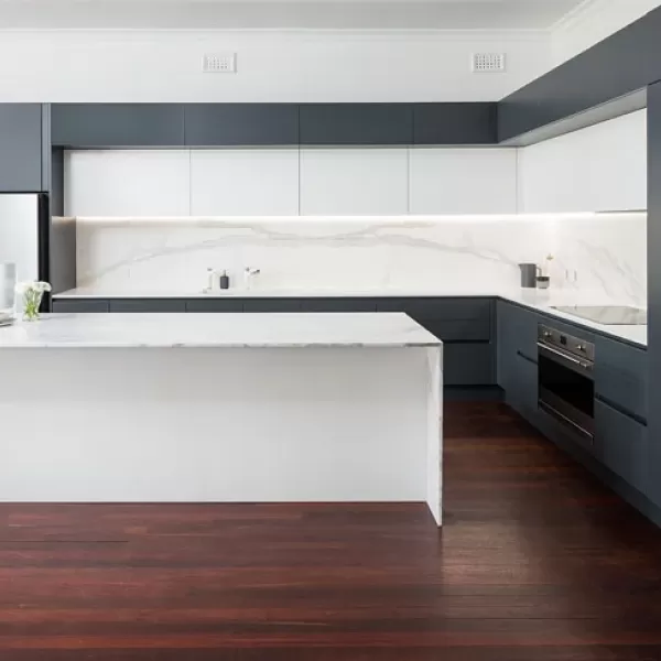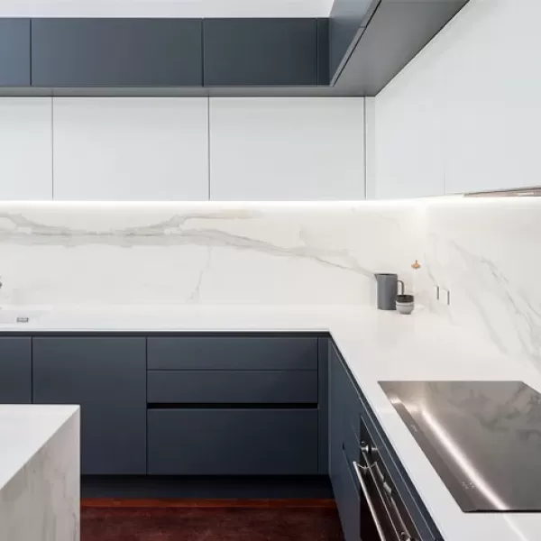 El tope de mármol y la barra trasera, las luces LED brillantes y las puertas sin costuras que se abren con los dedos combinan muy bien con el diseño, lo que hace que el espacio sea tan fresco, aireado y acogedor.