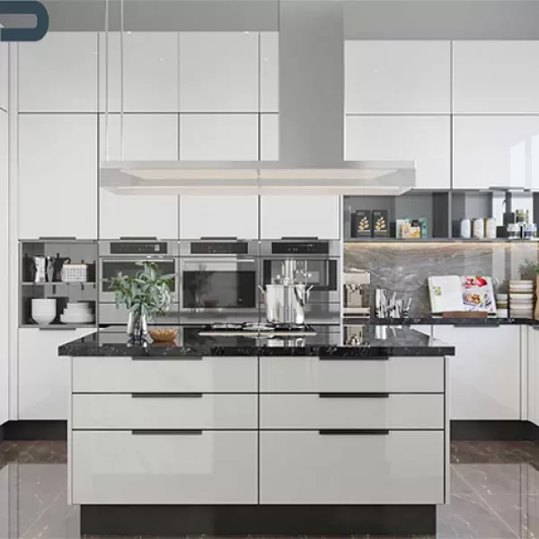 Los gabinetes de cocina de laca blanca de alto brillo son brillantes y contemporáneos. El color blanco es brillante, claro, lo que hace que el espacio de la cocina se vea más grande.