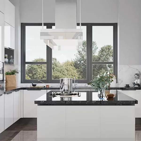 Las manijas de diseño simple en negro mate y la encimera de piedra de cuarzo negra, combinadas con gabinetes completamente blancos, crean una atmósfera elegante y noble.