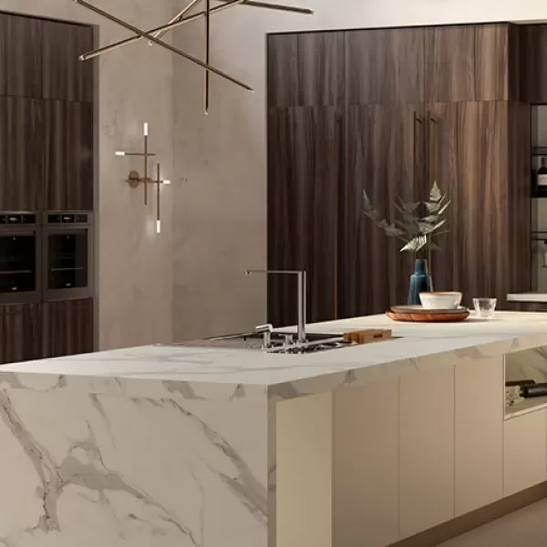 Los gabinetes de chapa de nogal y los electrodomésticos integrados están completamente integrados en la pared para crear un efecto limpio y elegante. La veta de madera de nogal oscuro en dos caras de las paredes solo se rompe por la encimera Calacatta y el protector contra salpicaduras.