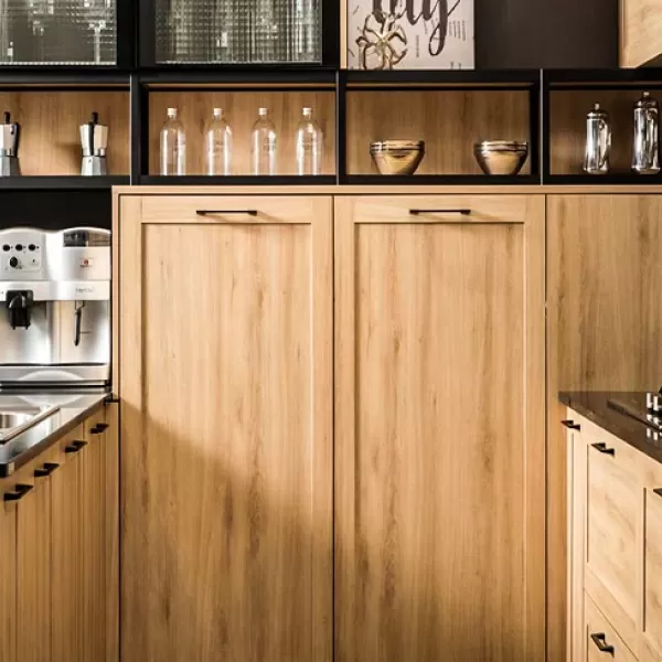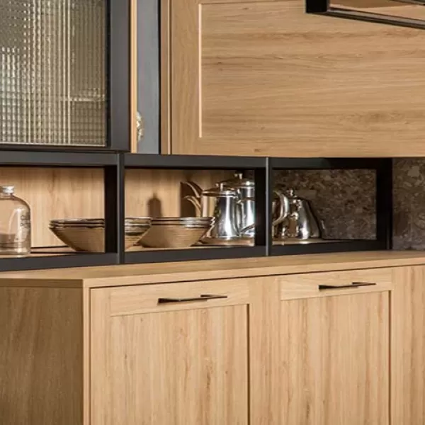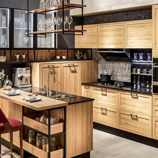 Este es un diseño de gabinete de cocina abierto con acabado de vetas de madera, que permite a las personas sentirse relajadas y de vuelta a la naturaleza.